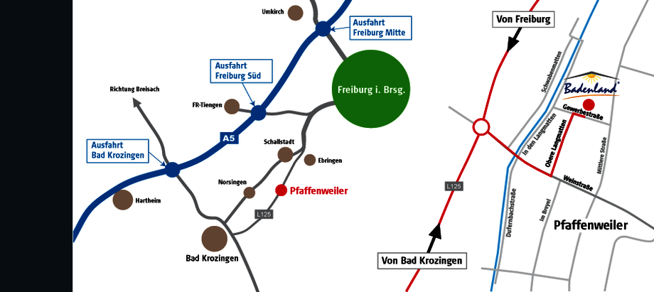 Wenn Sie über die A5 aus Richtung Basel kommen, nehmen Sie die Ausfahrt Bad Krozingen nach Bad Krozingen. Sie fahren an Bad Krozingen und der ersten Ausfahrt Richtung Freiburg/Schallstadt vorbei. Bei der 2. Ausfahrt Richtung Freiburg ist dann Pfaffenweiler angeschrieben und Sie fahren ab. Nun folgen Sie der Landstraße und fahren nach Kirchhofen erst beim 2. Kreisverkehr nach Pfaffenweiler ein. In Pfaffenweiler biegen Sie die dritte Möglichkeit links ab (Obere Langmatten). Nun die nächste Rechts abbiegen in die Gewerbestraße und Sie sind da.